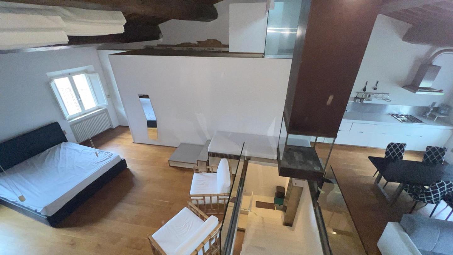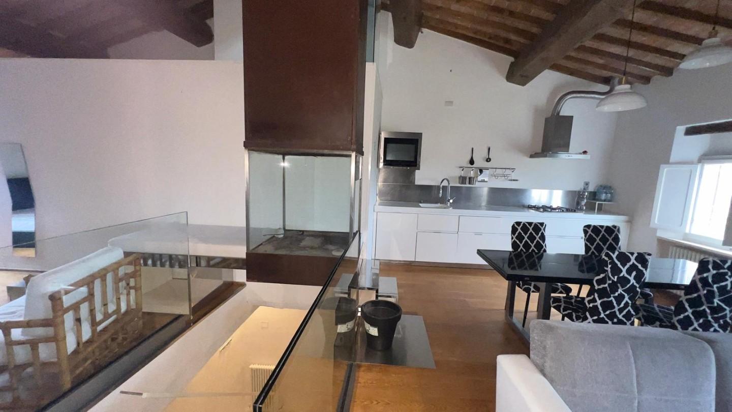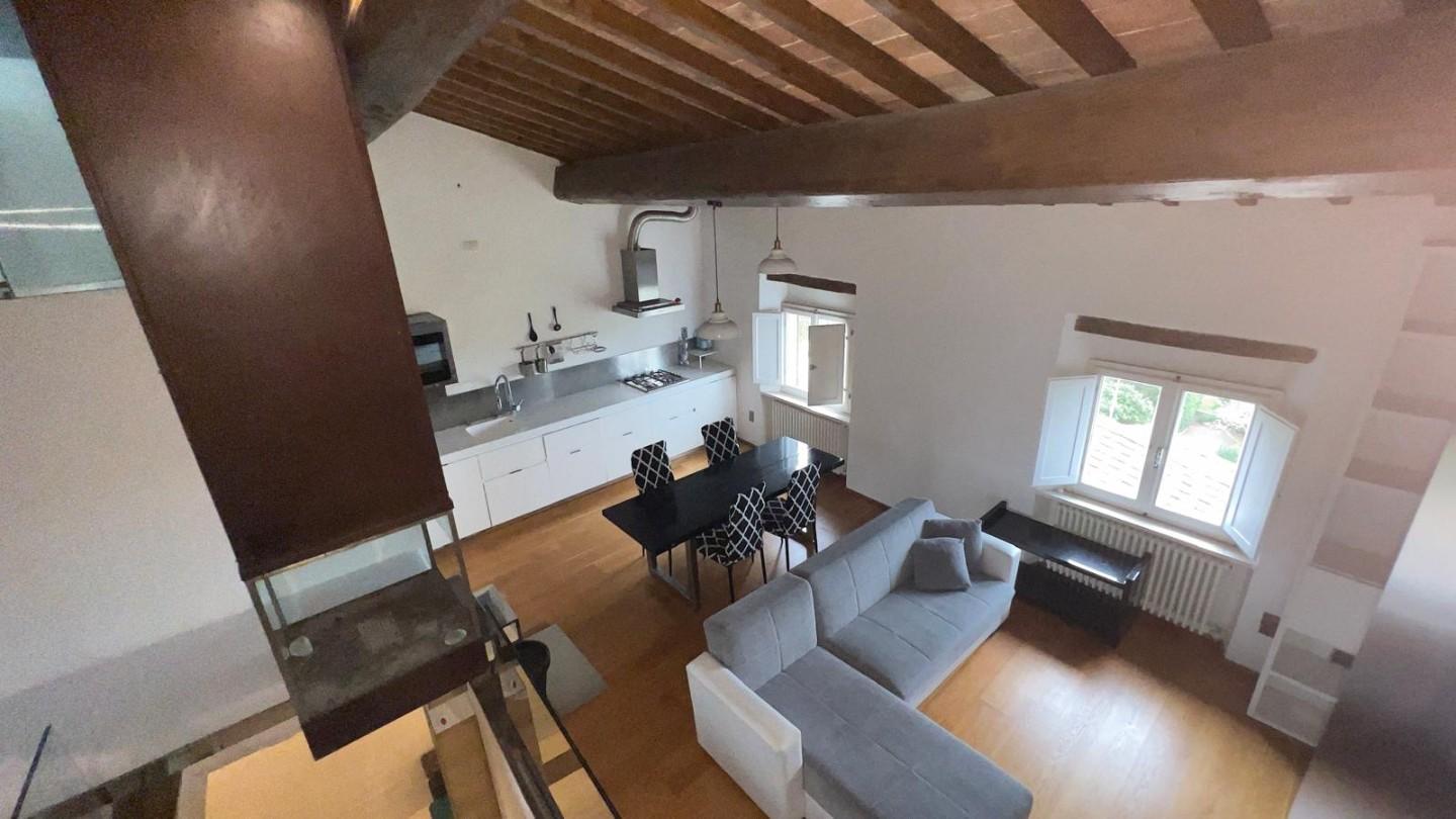 La zona living si sviluppa in un ampio open space caratterizzato da soffitti alti con travi in legno a vista e mezzane originali, autentica espressione dell’architettura toscana. Gli spazi, armoniosi e ben distribuiti, accolgono una cucina moderna a vista, perfettamente integrata con la zona pranzo e il soggiorno, creando un ambiente sofisticato e funzionale.