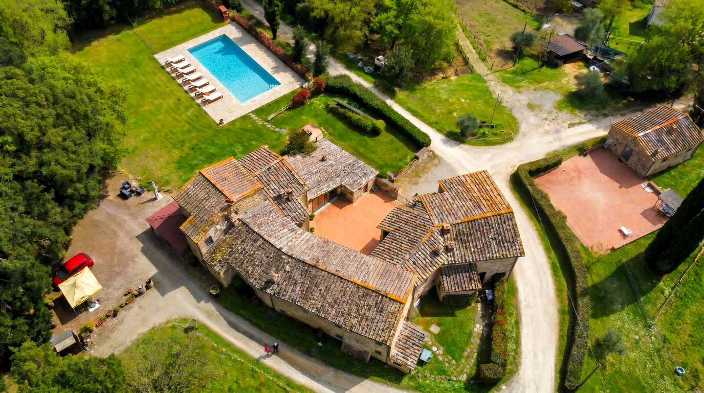 Attorno alla proprietà si estendono 26 ettari di terreno agricolo privato, con oliveto, boschi e spazi naturali che assicurano un isolamento totale. Una piscina a sfioro panoramica si apre verso le colline. Le produzioni della tenuta — olio, ortaggi, prodotti stagionali — alimentano direttamente l'offerta enogastronomica del ristorante.